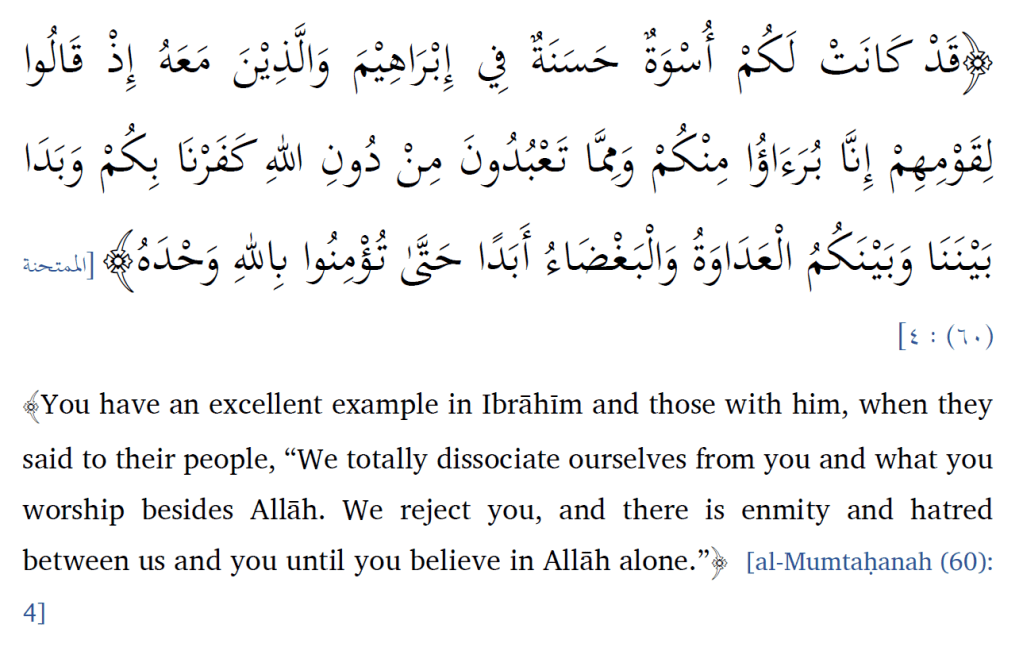 In addition to the āyah cited by Sh. Muḥammad b. ʿAbd al-Wahhāb in Thalāthat-ul-Uṣūl for the principle of al-Walāʾ and al-Barāʾ (Love, loyalty and allegiance to Allāh and hatred of and disassociation from disbelief and disbelievers), Sh. Ibn Bāz adds the following āyāt in his explanation of Thalāthat-ul-Uṣūl: