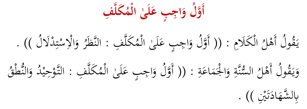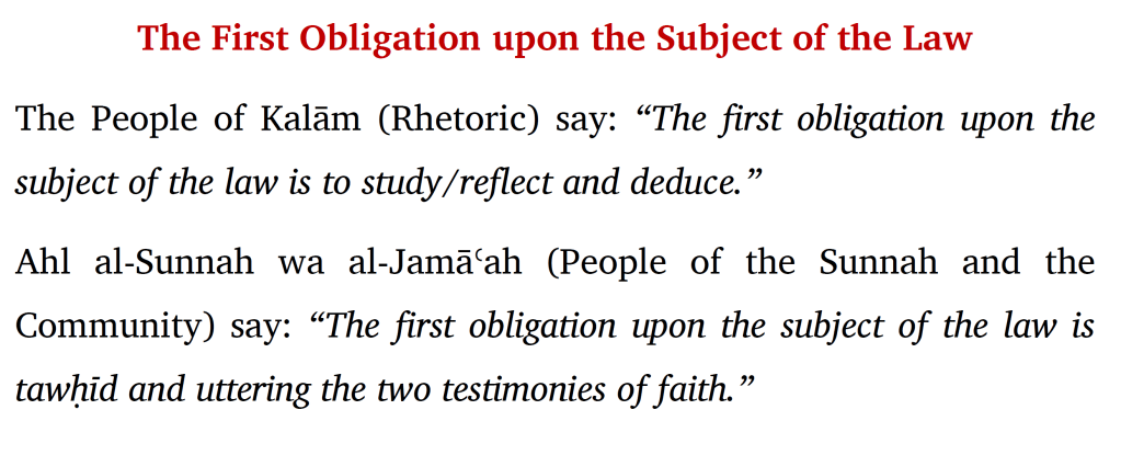 Note: this does not mean one should not use his intellect in reflecting upon the creation of Allāh, and making deductions about how the beauty and uniformity of the creation is an indication of the greatness and oneness of the Creator. This particular principle mentioned here, is to point out how the People of Rhetoric, contradict the Sunnah regarding what the first obligation is upon the mukallaf. A deeper discussion on this issue will have to be saved for another time.