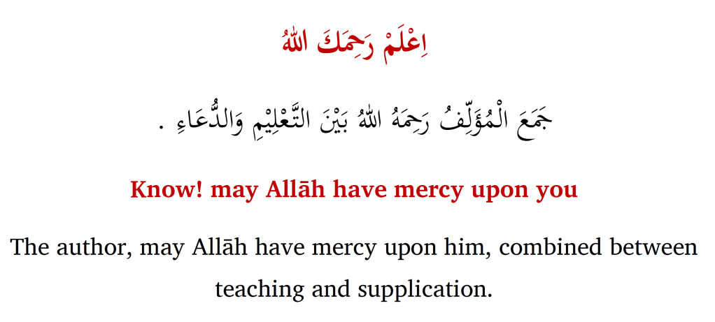 Imām Muḥammad b. ʿAbd al-Wahhāb, may Allāh have mercy upon him, begins Thalāthat-ul-Uṣūl (The Three Fundamental Principles), in quite a unique way. He expresses his care and concern for you, the reader, by instructing you to learn, and then coupling that with a supplication for you: